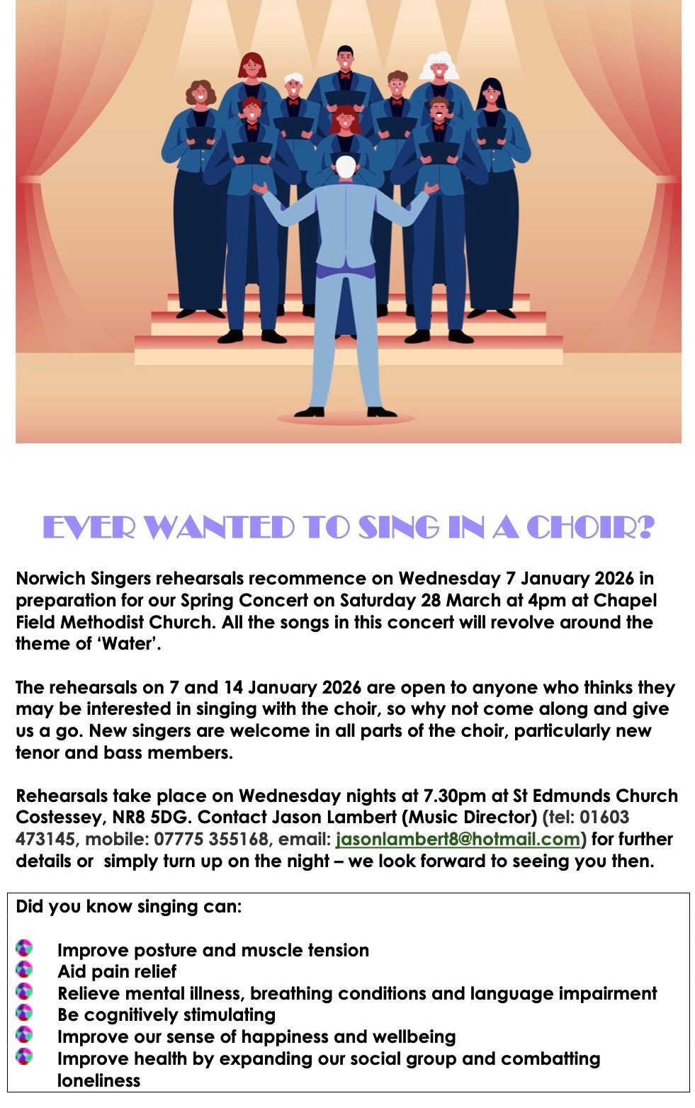 PLEASE NOTE THAT THE NORWICH SINGERS NOW REHEARSE AT ST EDMUNDS CHURCH, COSTESSEY, NORWICH NR8 5DG ON WEDNESDAY NIGHTS AT 7.30PM.